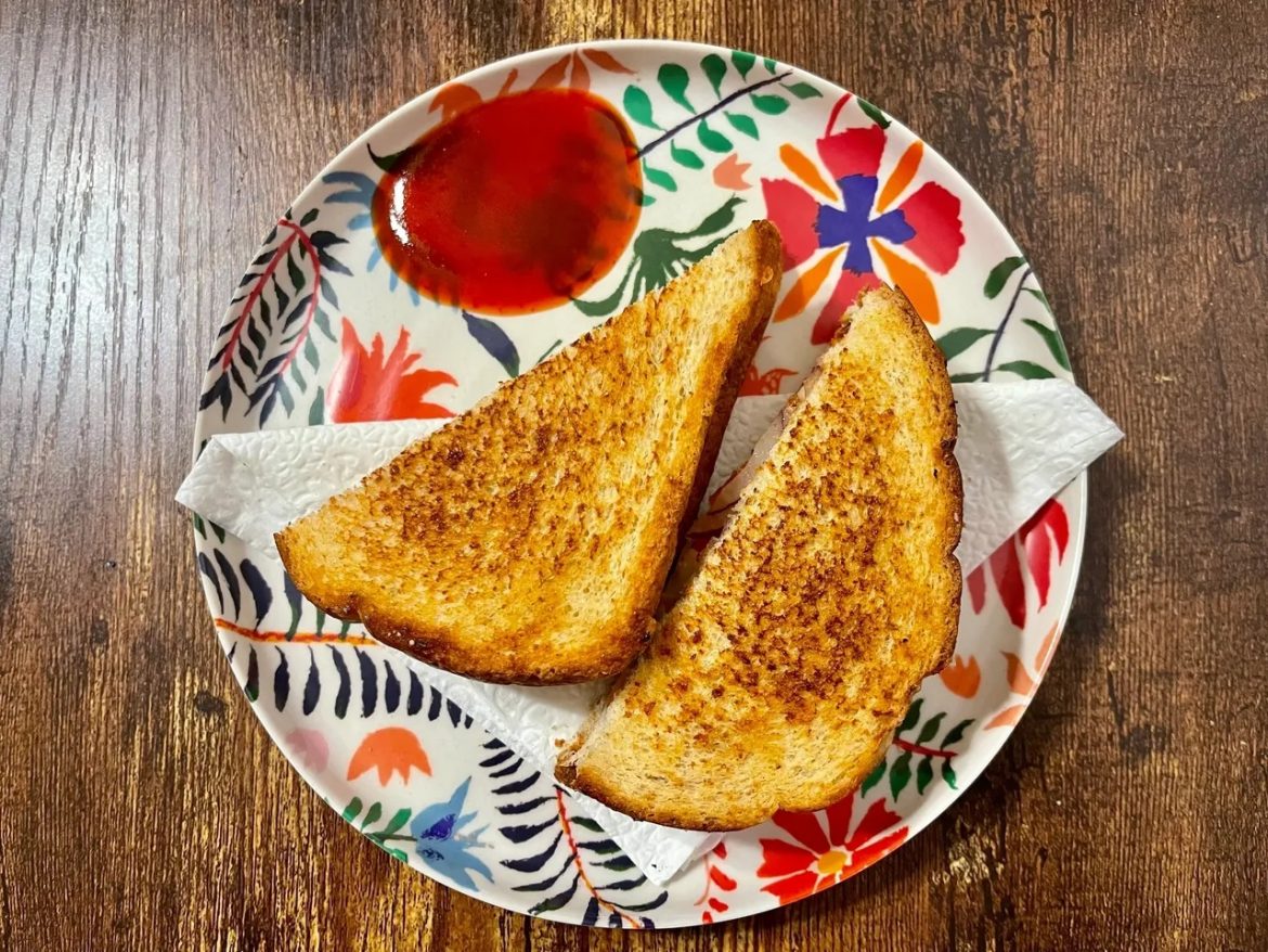 Once the slices turn light brown. We will use one slice as a base and another to top it after layering our veggies-cheese.